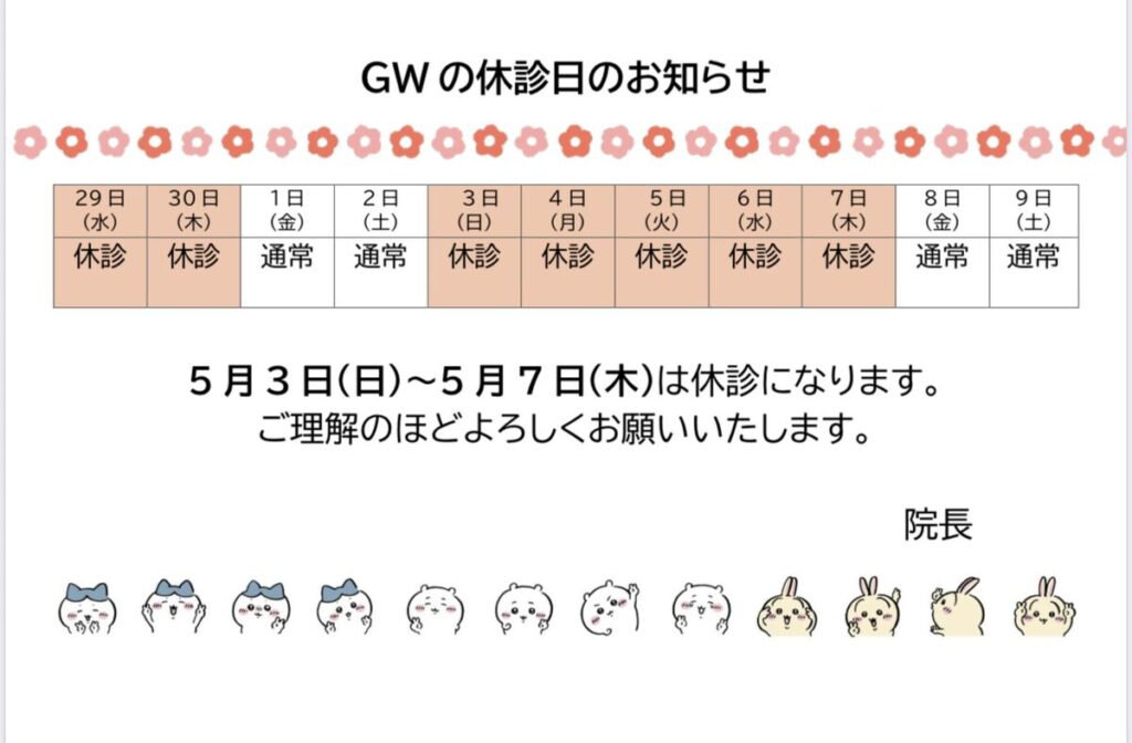 さて、当院のゴールデンウィーク期間中の診療についてお知らせです。